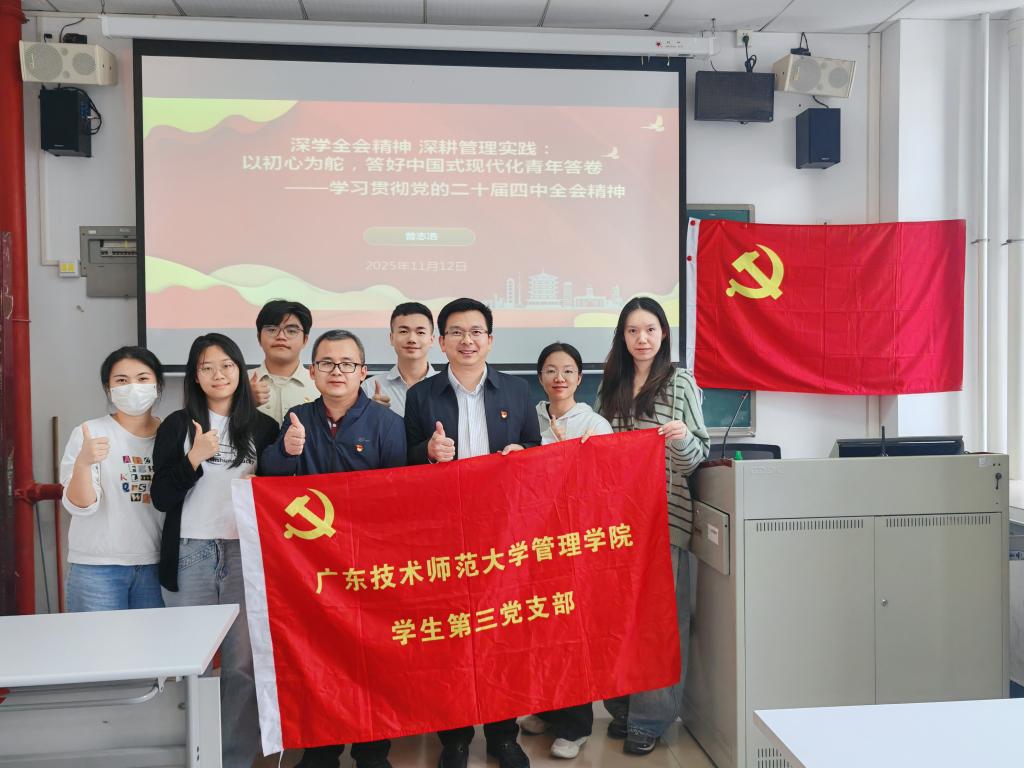 接着,曾志浩以《深学全会精神,深耕管理实践:以初心为舵,答好中国式现代化青年答卷》为题作辅导报告。他结合国内外发展形势与广东科技创新实践,深入阐释了党的二十届四中全会精神与管理学科发展的内在联系,引导学生党员立足AI时代背景,发挥专业优势,积极投身产业升级与社会治理创新,为实现中国式现代化贡献智慧和力量。
