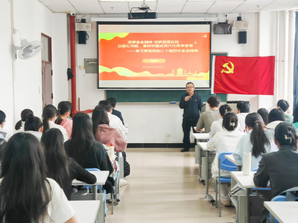为深入学习贯彻党的二十届四中全会精神,引导青年学子深刻把握“十五五”时期经济社会发展的指导思想、重大原则、主要目标、重大战略任务,11月12日中午,管理学院在白云校区第一教学楼503室开展党的二十届四中全会精神学习宣讲活动,邀请马克思主义学院副院长曾志浩作专题报告。管理学院党委书记陈军及50多名学生党员参加了学习,会议由专职组织员庄信畅主持。