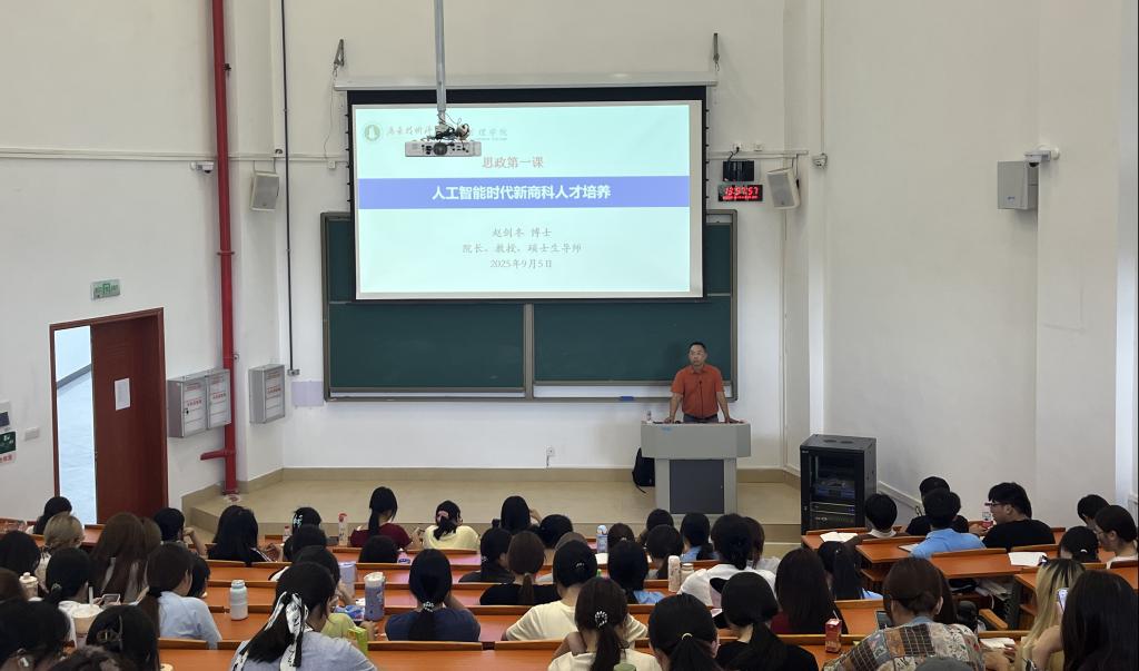 10月16日,管理学院党委书记陈军、院长赵剑冬分别在河源校区唯实楼202、博学大讲堂204为2025级本科新生讲授2025年秋季学期“思政第一课”。河源校区辅导员及2025级新生共同上课学习。
