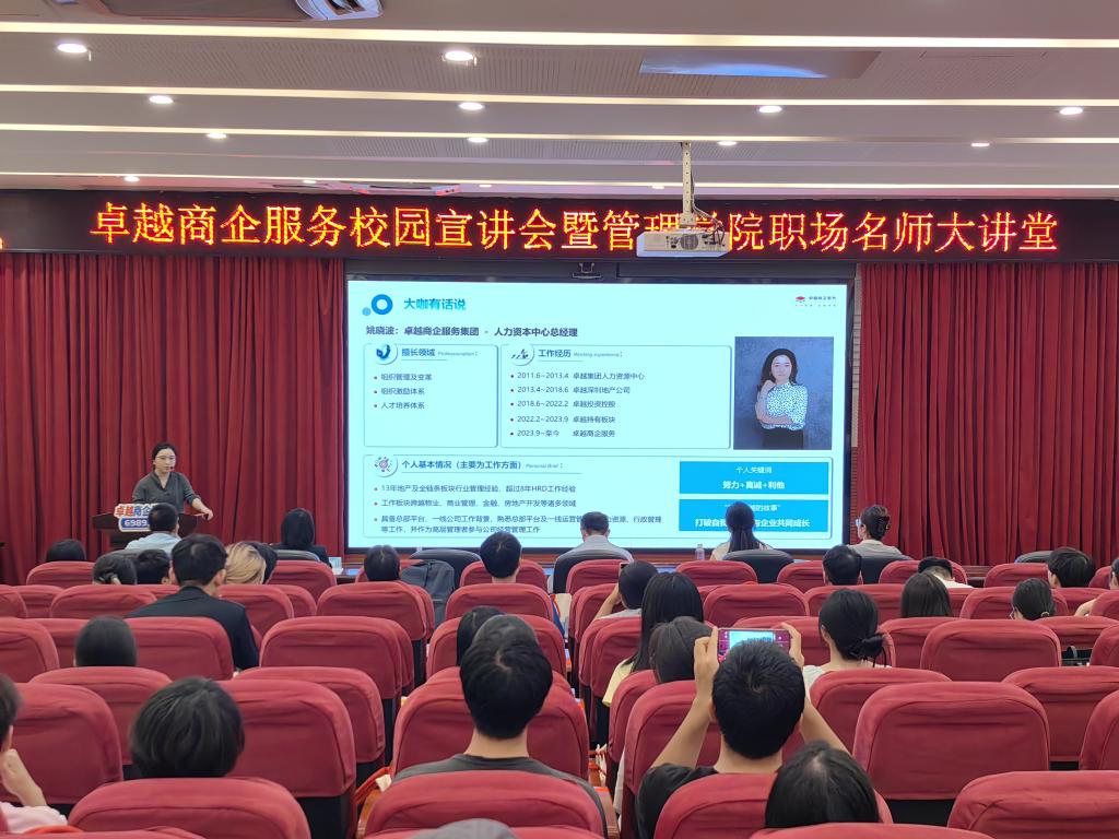 随后,双方移步至白云校区三教104报告厅,共同举办校园招聘宣讲会暨管理学院名师大讲堂活动,出席活动的还有管理学院2025届校友黄蔚俊和郑海蓝,活动吸引了校内百余名学子参与。