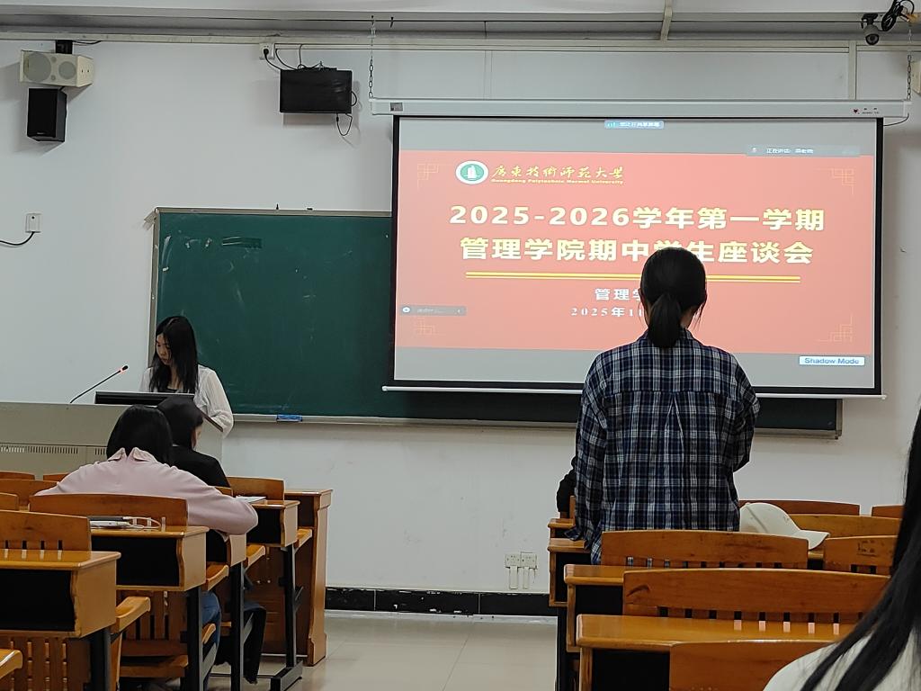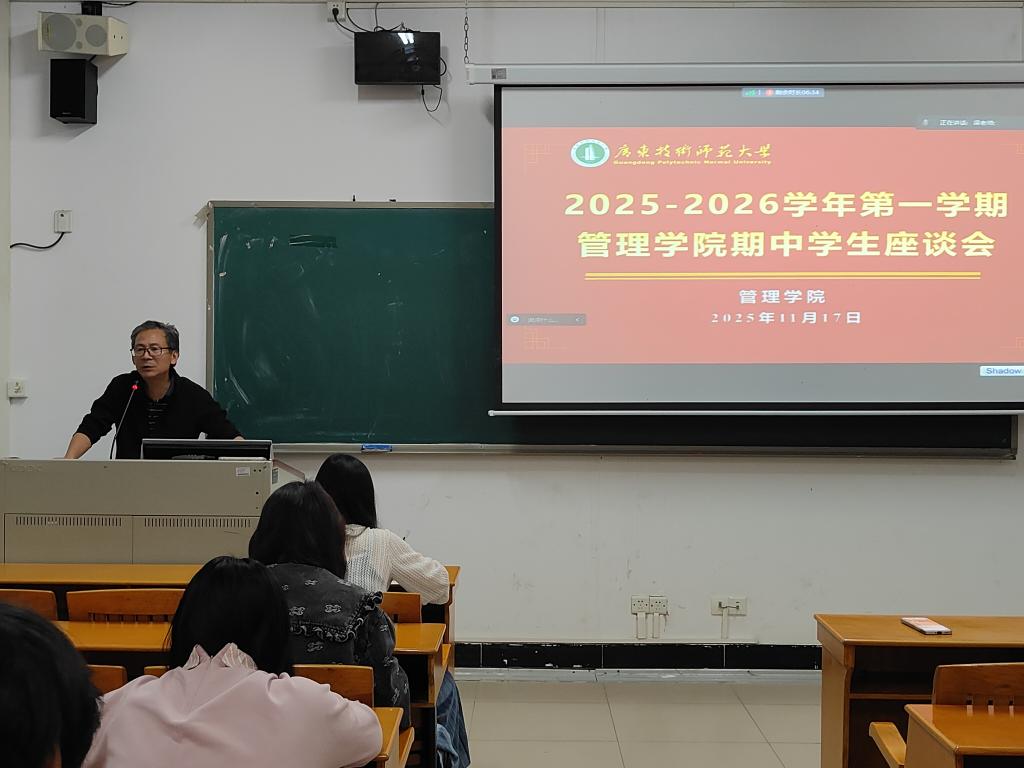 为深入了解本学期开学以来的教学运行状况和学生的学业动态与需求,及时回应和解决学生在学习过程中遇到的实际问题,持续提升教学质量与管理服务水平,11月17日中午,管理学院于白云校区一教109教室召开了2025-2026学年第一学期期中学生座谈会。管理学院教学副院长姚建华、教务员谢丽萍、侯琳子、梁颖欣老师以及2022级至2025级各班学习委员和学生教学信息员共同参加了此次座谈。