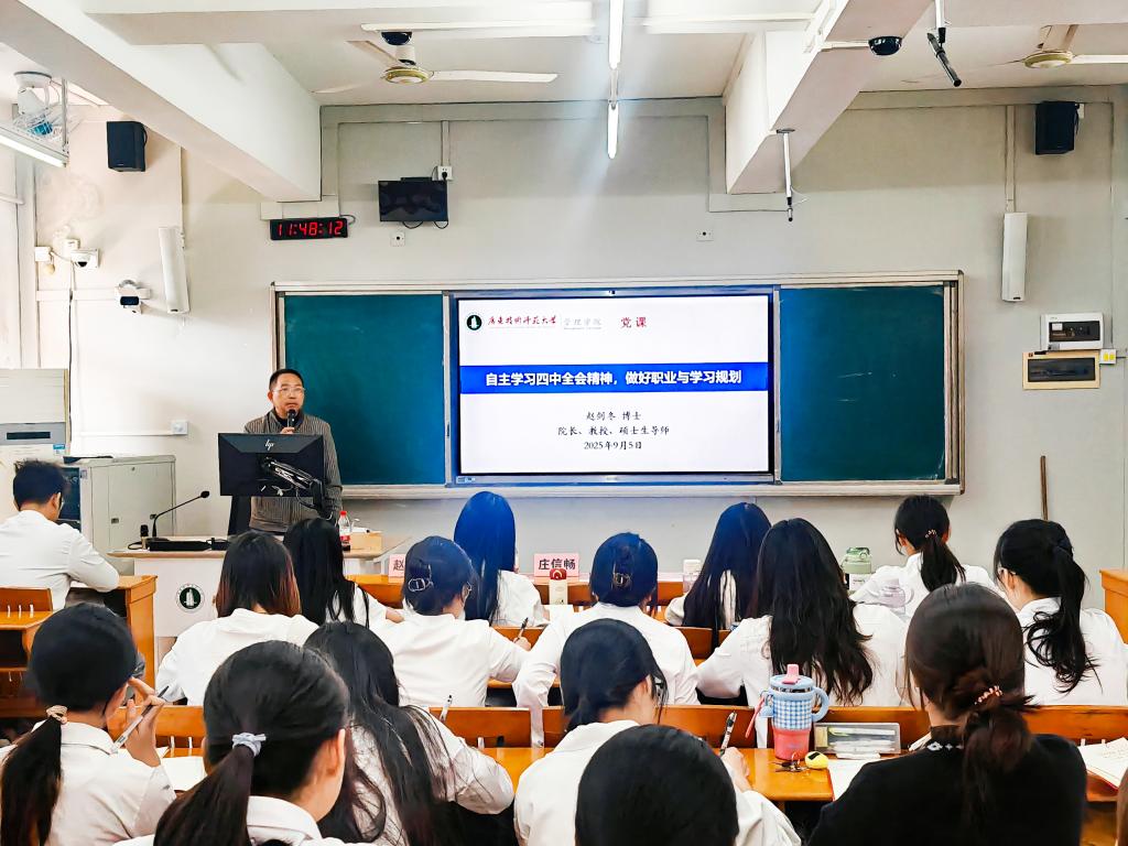11月26日,在白云校区第三教学楼509室,赵剑冬以《自主学习四中全会精神,做好职业与学习规划》为题讲授专题党课。他指出,深入学习贯彻党的二十届四中全会精神,不仅要在理论上学深悟透,更要转化为行动上的自觉实践,应与青年学生的职业生涯规划发展紧密结合。他鼓励同学们以全会精神为指引,主动规划未来,扎实付诸行动,在时代发展的坐标中找准个人定位,努力将青春理想融入中国式现代化建设的伟大征程。