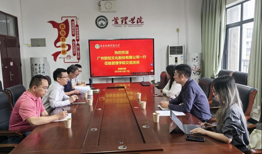 3 月 31 日,广州致知文化股份有限公司刘捷、肖碧营、陈伊琪一行到访管理学院,就深化校企合作、推进产教融合等事宜开展专题座谈。管理学院党委书记陈军、院长赵剑冬、副院长姚建华、柳建华博士参加会议。