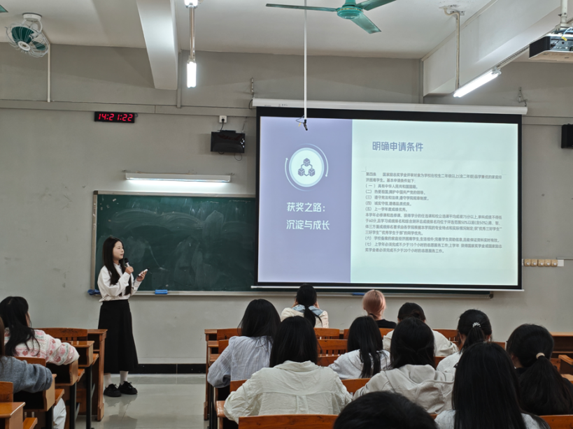 为展现“勤学、善思、笃行”的成长底色,充分发挥榜样示范作用,激励广大学子砥砺奋进,2025年12月18日,管理学院在白云校区三教206举办了“以榜样为灯,秉初心致远”主题国奖国励分享会。活动邀请国家奖学金获得者吴晓雯、国家励志奖学金获得者叶顺奇和刘优优作为分享嘉宾,与学院学子面对面交流,管理学院辅导员杨晓霞老师及部分学生代表参与本次分享会。
